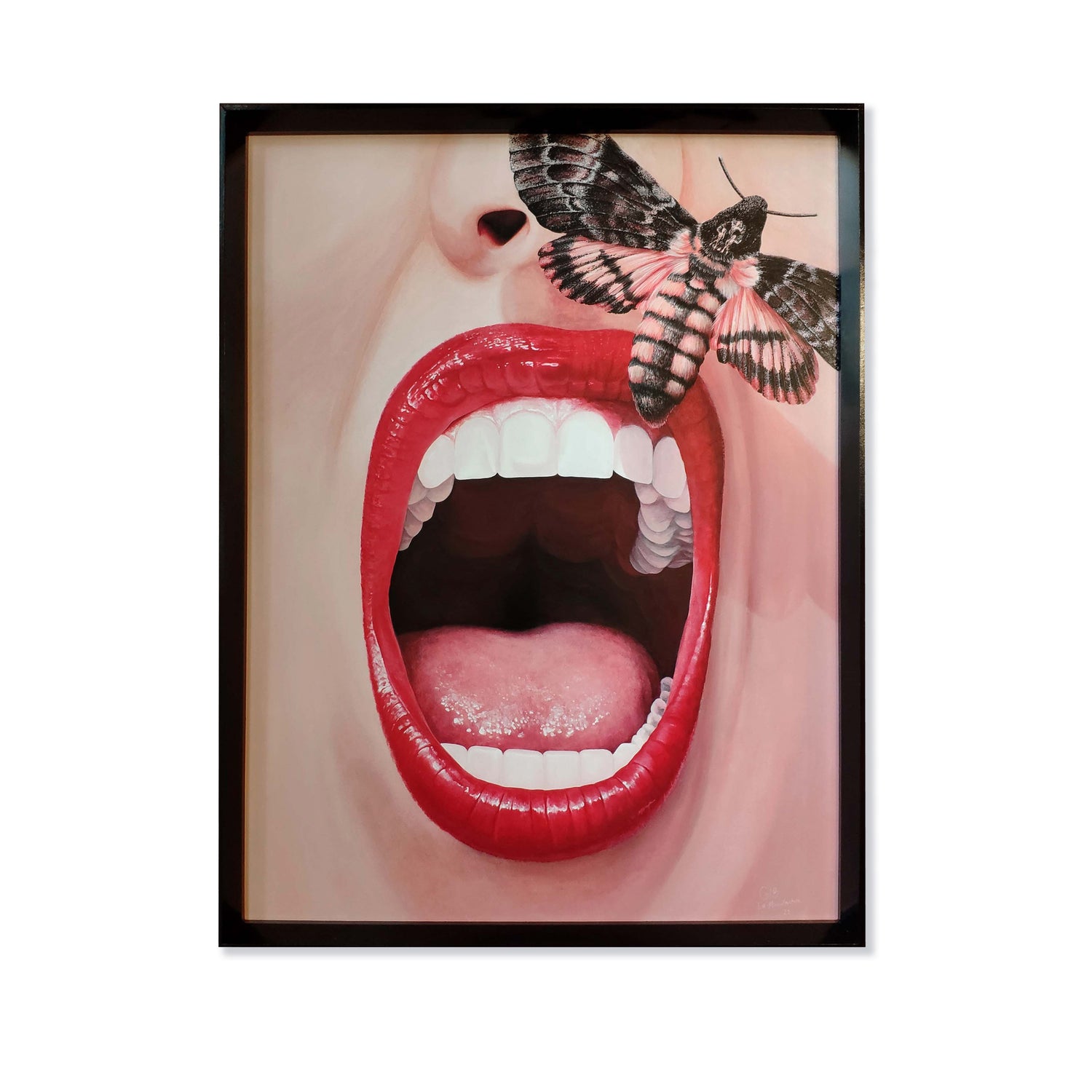 L’œuvre ici imagine l’après cet emprisonnement moral et physique des femmes. D’après les superstitions, la présence du papillon sphinx annonce une mort imminente au sein du foyer. Ici l’insecte s’envole, s’enfuit, libère.